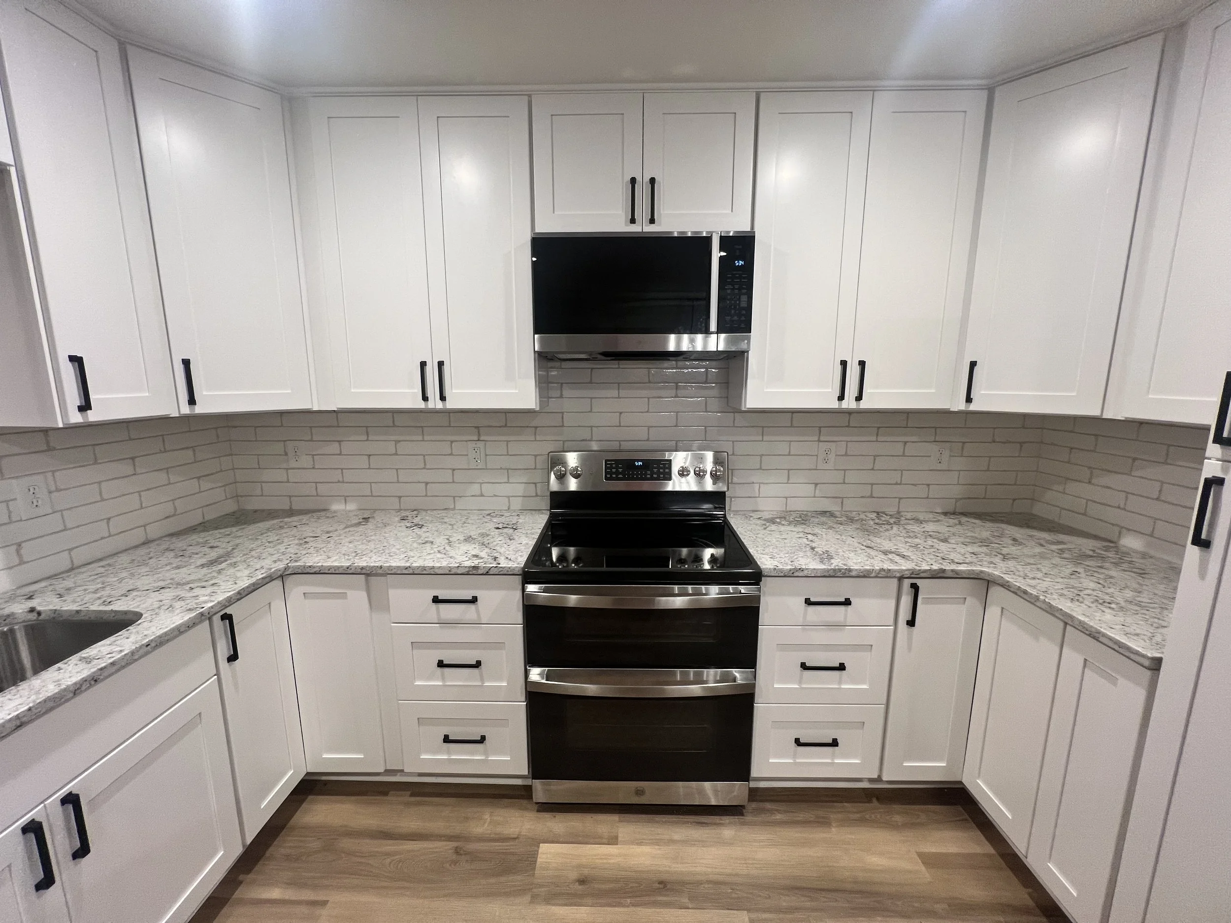 Full kitchen remodel featuring white shaker-style cabinets with black pulls, a touchless faucet, and elegant granite countertops. - Zebulon, NC
